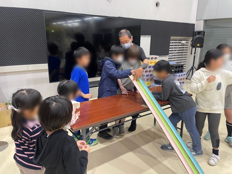 とにかく子供たちの興奮が並ではなく、僅か40分ほどのサイエンスショーでは物足りないようで、時間の関係で省略した液状化ボトル「エッキー」を帰り際に見つけた児童に説明しようとしたら、あっという間に大勢に取り囲まれてしまいました。今回、ブロック倒しは興奮しすぎの子供たちにやらせると授業崩壊しそうだったので、「自分の担任の先生に、下敷きになってもらいたい人」と言ったら、さらにヒートアップして、子どもたちの興奮は大爆発でした!
